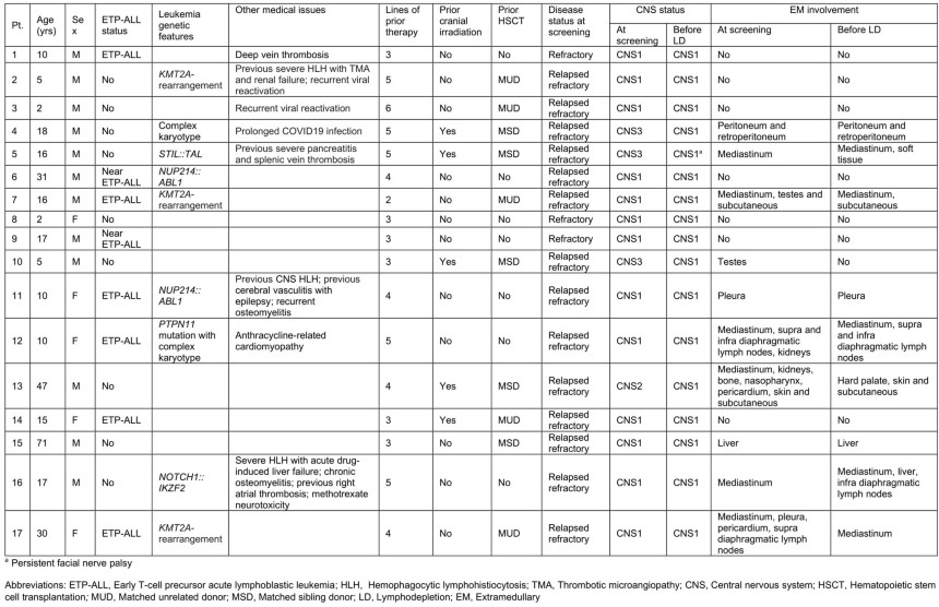 Extended Data Table 1 Demographics and clinical status of the 17 patients with T-ALL treated with anti-CD7 PEBL-CAR-T cells