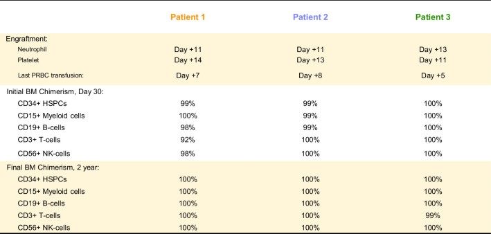 1. All patients engrafted neutrophils, platelets and red blood cells promptly within 2 weeks of HSCT with resolution of prior cytopenia (n = 3). Near complete multi-lineage donor chimerism was observed at both short-term and long-term timepoints post-HSCT. All chimerism data in table is reported from bone marrow.