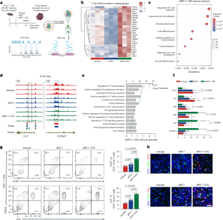a, Volcano plot of differentially expressed genes between αPD-1 + DQ and Isotype groups (left), αPD-1 and Isotype groups (middle), αPD-1 + DQ and αPD-1 groups (right). b, DEGs (Log2Foldchanges > 0.5) of CD4 naïve T cells in tumors between αPD-1 and Isotype groups enriched GO terms. c, Proportions of the ATAC-seq peak regions representing various genome annotations identified in Isotype, αPD-1 + DQ and αPD-1 groups. d, The heatmap of different annotated genes in Isotype, αPD-1 and αPD-1 + DQ groups from ATAC-seq. e, Venn diagram of peaks of CD4 naïve T cells in Isotype, αPD-1 and αPD-1 + DQ groups. f, ATAC-seq tracks showing the representative genes chromatin accessibility in the Lck, Cfd, and Slfn2 loci for CD4 naïve T cells in Isotype, αPD-1 + DQ and anti-PD-1 groups. g, RNA-seq and ATAC-seq detected GO terms that were simultaneously enriched in the αPD-1 group and Isotype group (left) and GO terms that were enriched in open chromatin regions unique to the αPD-1 + DQ group and αPD-1group (right).