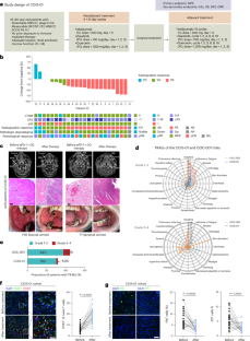 a, Trial flow diagram. b, Representative pre- and post-treatment intraoral photographs, H&E staining, and MRI images for MPR and noMPR patients. Scale bar = 50 μm. c, The changes and proportional statistics of TNM staging after treatment for lymph nodes in different patients. d, Scatter plot depicts the pathological response and radiographic response of the primary tumor after neoadjuvant treatment in the same patient (left), and the radiographic response of the primary tumor and lymph node metastasis in the same patient after neoadjuvant treatment (right). e, Pathological response of the primary tumor in patients treated with different cycles during neoadjuvant therapy (left), radiographic response of the primary tumor in patients treated with different cycles during neoadjuvant therapy (middle), and all remission include primary tumor and lymph node metastasis in patients treated with different cycles during neoadjuvant therapy (right). Sample sizes by treatment cycle: 2 cycles (n = 25), 3 cycles (n = 22), 4 cycles (n = 4). f, The rates of MPR for patients after 2 cycles, 3 cycles, and 4 cycles of treatment, as well as the rates of Grade 1-2 adverse events and Grade 3-4 adverse events. g, Survival curves for patients in this clinical trial at the 24-month follow-up. h, Disease-free survival (DFS) and OS curves for patients in this clinical trial at the 24-month follow-up. Boxes represent interquartile range (IQR, 25th–75th percentile), horizontal lines within boxes indicate medians, whiskers extend to 1.5×IQR.