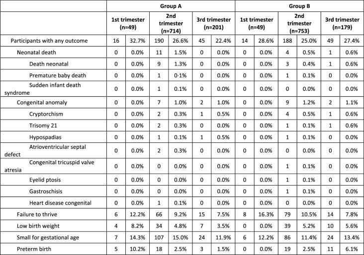 1. This table presents the adverse neonatal/infant outcomes of interest by group and by trimester of randomization. There appear to be some differences in terms of the trimester at randomization. For example, the percentage of participants with any outcome of interest in group A (16/49 (32.7%) in their first trimester, 189/714 (26.5%) in their second trimester and 45/201 (22.4%) in their third trimester) appears different from group B (14/49 (28.6%) in their first trimester, 186/753 (24.7%) in their second trimester and 49/179 (27.4%) in their third trimester). As another example, the data suggest a relationship between failure to thrive and group by trimester (the highest percentages were observed in women in their first trimester in both groups) and a different relationship between preterm birth and group by trimester (the highest percentages were observed in women in their first trimester in group A and women in their third trimester in group B). The confidence intervals are wide around estimates from the relatively small number of women randomized during their first trimester. Differences are attributed to random variations due to the small number of women in their first trimester, and no biological explanation for these patterns can be drawn.