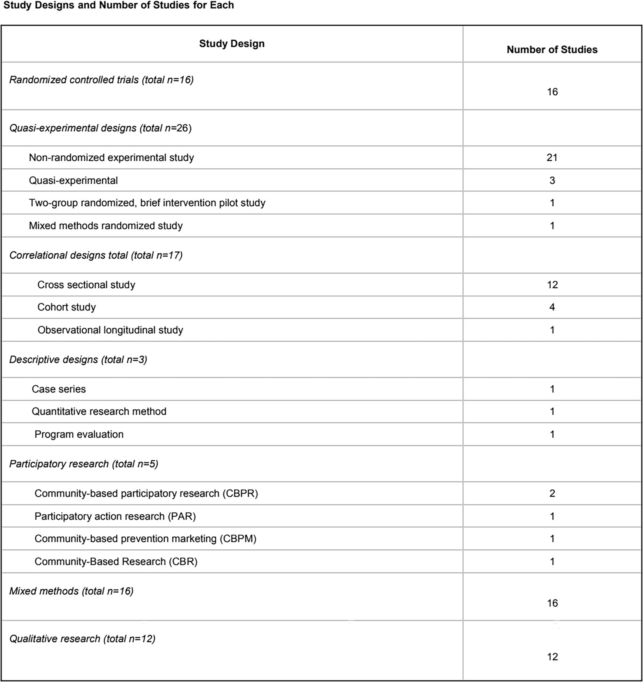 1. Study designs and number of included studies in each category.