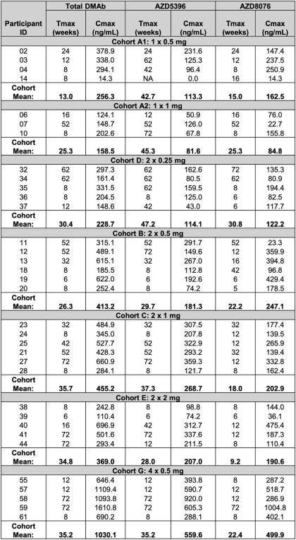 Extended Data Table 2 Tmax and Cmax values for individual DMAbs