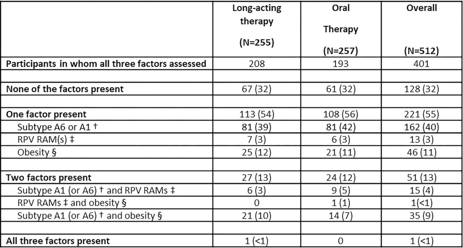 1. * Table shows number of participants (and proportion of those assessed) with each potential risk factor or combination of risk factors for virological failure within the 401 participants in whom all 3 risk factors were assessed. The three risk factors are those identified in multivariable analyses of pooled data from previous trials of long-acting therapy (Orkin et al, Clin Infect Dis 2023; 77 (10) 1423-1431).