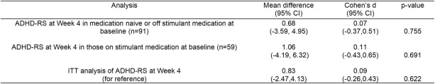 Extended Data Table 9 Subgroup analysis of primary outcome ADHD-RS total score at week 4 in participants who were off medication/medication-naïve at baseline