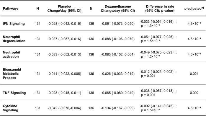 Extended Data Table 4 Changes in CSF pathogenesis pathways from day 0 to 30 in CC-genotype participants
