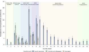 Bars represent weighted mean levels of conflicts with 95% confidence intervals. The analyzed sample sizes of waves 1 and 2 (aged 18 years or above) were 17,000 and 12,896, respectively. All participants of waves 3 to 23 were included, with the respective sample sizes presented in Extended Data Fig. 3. Inverse probability of censoring weighting and raking were applied.