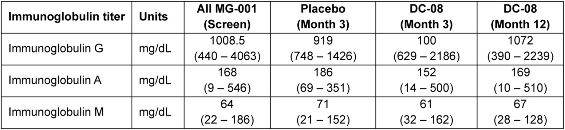 1. Measurements were taken at SCR (n = 33), placebo at month 3 (n = 15), and Descartes-08 at month 3 (n = 19), and month 12 (n = 13). Table shows median and range. Immunoglobulin titers did not decrease from SCR in either placebo or Descartes-08 cohorts at any timepoints analyzed.