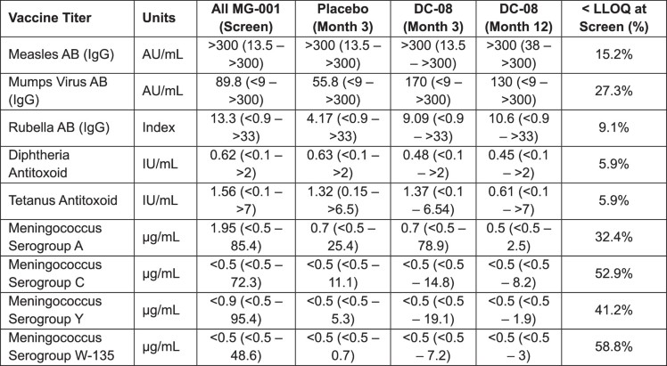 1. Measurements were taken at SCR (n = 33), placebo at month 3 (n = 15), and Descartes-08 at month 3 (n = 19), and month 12 (n = 13). Table shows median and range. Vaccine titers were unchanged from month 3 to month 12 in the Descartes-08 group.