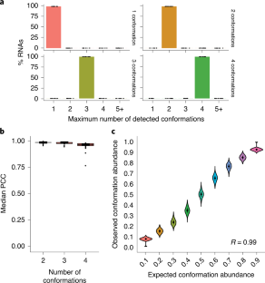 a, Maximum number of conformations detected for 10 sets of 100 simulated RNAs, with length ranging from 600 to 1,500 nt, expected to form 1 to 4 conformations, at a coverage of 5,000X and a read length of 150 nt. Data are presented as mean values ± SD of the 10 sets. The individual data points, representing the mean of each set, are shown. b, Box-plot of median Pearson correlation coefficients (PCC) of reconstructed reactivity profiles for 10 sets of 100 simulated RNAs, with length ranging from 600 to 1,500 nt, expected to form 1 to 4 conformations, at a coverage of 5,000X and a read length of 150 nt. When DRACO detected more than one window with different numbers of clusters, only the largest window, spanning >50% of the RNA length, was considered. Boxes span the 25th to the 75th percentile. The center represents the median. Whiskers span from the 25th percentile – 1.5 times the IQR, to above the 75th percentile + 1.5 times the IQR. Data points falling outside of this range represent outliers and are reported as dots. c, Violin plot depicting the distribution of expected versus reconstructed conformation abundances for 10 sets of 100 simulated RNAs, with length ranging from 600 to 1,500 nt, expected to form 2 conformations with varying relative abundances, at a coverage of 5,000X and with a read length of 150 nt. When multiple windows were detected, only the largest window was considered. The Pearson correlation is indicated in the bottom-right corner of each plot. Whiskers span the 25th to the 75th percentile. The central dot represents the median.
