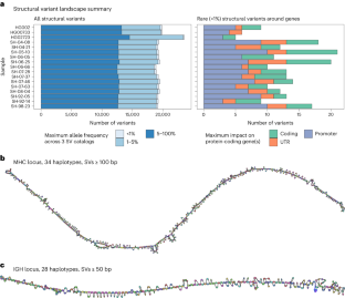 Similar to Fig. 5a but including SVs close to centromeres, telomeres, or within segmental duplications were removed. Number of SVs across samples. In the left panel, SVs were annotated with three SV catalogs (the gnomAD-SV database, a long-read-based SV catalog, and the HPRC v1.0 SV catalog). SVs are matched if they have at least 10% genomic overlap. The colors highlight the maximum frequency across these catalogs, the lighter blue showing ‘rare’ SVs (with an allele frequency below 1%) in the catalogs, or unmatched. SVs may be unmatched, either because they are novel or due to the difficulties in the database comparison. The right panel shows the number of rare SVs in protein-coding genes, grouped by their impact on the gene structure.