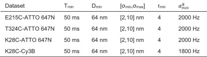 1. The data from the four kinesin-1 constructs was filtered with respect to the following parameters: the minimum trace duration Tmin, the minimum covered distance Dmin, the minimum and maximum off-axis spatial standard deviation [σminmax], the minimum ratio of spatial standard deviations in on- and off-axis direction rmin and the maximum brightness (detection rate) fluctuations \({\sigma }_{\max }^{k}\).