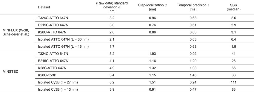 1. The spatial and temporal precision as well as the SBR of the MINFLUX tracking data from ref. 9 and the MINSTED data from the present study are displayed for comparison.