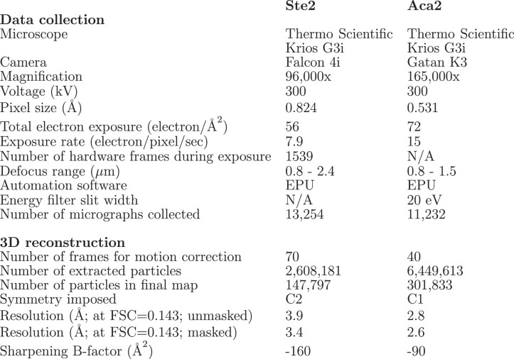 Extended Data Table 1 Cryo-EM datasets of Ste2 and Aca2. Details on cryo-EM data collection and processing of the Ste2 and Aca2 datasets are presented
