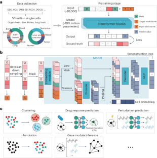 All data used in this study are publicly available and the usages are illustrated in the Methods. The pretraining datasets were mainly downloaded from GEO (https://www.ncbi.nlm.nih.gov/geo/), Single Cell Portal (https://singlecell.broadinstitute.org/single_cell), HCA (https://data.humancellatlas.org/) and EMBL-EBI (https://www.ebi.ac.uk/), and the detailed dataset list we used is in Supplementary Data 1 and 2. The datasets used for downstream tasks can be downloaded from the following links: Baron dataset (https://github.com/mohuangx/SAVER-paper); Zheng68K dataset (https://www.dropbox.com/sh/w3yg2nucnng5v1u/AAAM8Ym_KU9XF4z51RT81eNEa?dl=0); Segerstolpe dataset (https://zenodo.org/records/3357167); CDR dataset (https://github.com/kimmo1019/DeepCDR); Single cell drug response classification dataset (https://github.com/CompBioT/SCAD); Perturbation dataset (https://github.com/snap-stanford/GEARS); Simulated reference and query dataset used for cell mapping (https://doi.org/10.6084/m9.figshare.21456645.v4); and Organoid and in vivo data used for cell mapping (https://doi.org/10.17632/sm67hr5bpm.1). The processed gene expression data and the embeddings generated by scFoundation can be found in our GitHub repository (https://github.com/biomap-research/scFoundation) and figshare (https://doi.org/10.6084/m9.figshare.24049200) (ref. 74).