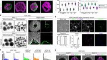 To create a FGF8 gradient in vitro, we leveraged a spheroid–organoid fusion strategy27 and generated mosaic organizer-like embryoid bodies (OrEBs) by mixing non-fluorescent hPS cells engineered to constitutively produce and secrete FGF8 (CAG > FGF8) with hPS cells expressing tdTomato to enable EB visualization by fluorescence (CAG>tdTOMATO; Fig. 1d and Extended Data Fig. 1). Fusion of mosaic OrEBs containing 1% or 10% CAG > FGF8 cells with EBs aggregated from SP8 > GFP reporter cells (round assembloids) induced expression of the early downstream effector ETV1 in both conditions (Extended Data Fig. 2a), validating active FGF signaling. Furthermore, 10% CAG > FGF8 assembloids induced stronger expression of FGF8 signaling downstream effectors (ETV1, ETV4, DUSP6, SPRY2, SEF, SPRY4) 1 day after fusion, indicating modulation of FGF8 signaling by OrEB composition (Fig. 1e). Analysis of SP8 > GFP expression at 60 div reported an increase in GFP intensity in accordance with the percentage of CAG > FGF8 cells (Fig. 1f,g), demonstrating the ability of OrEBs to induce rostral cortical fates in a composition-dependent manner. However, 1% CAG > FGF8 assembloids exhibited the typical ventricular zone-like rosette morphology as marked by nuclei positioning and rosette immunostaining for the rostral marker LMO4 (Extended Data Fig. 2b–e). RT–PCR analysis of 1% FGF8 fusions confirmed reduced gene expression related to other FGF8-influenced developmental processes, including eye and neural crest development (Extended Data Fig. 2f). Together, these data demonstrate that mosaic OrEBs with 1% CAG > FGF8 cells can induce rostral telencephalic fates while maintaining proper organoid tissue morphology.