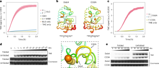 a, End-point emission spectra of samples in Fig. 2a. b, Fluorescence of TME with unfolded BLG in the presence of 0.025 – 8 mM GSH. Arrow indicates intracellular protein to glutathione thiol ratio, that is, 7:3. n = 4 biological replicates; mean ± s.d. c-d, TME fluorescence measured by the plate reader in Fig. 2d and e. Sample solutions were aliquoted from the in-gel fluorescence samples. n = 4 technical replicates; mean ± s.d. Results were consistent with kinetic curves (Fig. 2a and c).