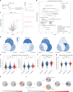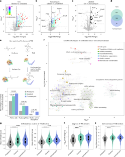a, Strategies to interpret proteomics results. In each dataset, there were four experimental conditions: TME-/Drug-, TME + /Drug-, TME-/Drug + , TME + /Drug + . Each experimental condition was processed parallelly with the RUBICON workflow. Note that unlabeled proteins can be potentially enriched by Dynabeads, that is, non-specific binders. Comparison of TME-/Drug- and TME + /Drug- identified TME binders in control condition, for example, Fig. 3a. Comparison of TME-/Drug+ and TME + /Drug+ identified TME binders in drug treated conditions, for example, Fig. 3b. Comparison of TME + /Drug- and TME + /Drug+ identified proteins with higher abundance upon drug treatment using RUBICON, for example, Fig. 3c. Among these proteins, the TME labeled ones were proteins that became more disordered in stressed conditions. They were identified as the intersections of significant hits in Fig. 3b and c, for example, and labeled with their gene name. Created with BioRender.com. b, Western Blot results for validation of proteins enriched from untreated or tunicamycin treated cells with or without TME using the RUBICON workflow. c, The number of proteins (protein counts) detected in TME labeled/unlabeled, and tunicamycin treated/untreated cells, shown on the top of each bar plot. Protein counts in each condition were calculated as the number of proteins detected in all triplicates. For this calculation, mass spectra were searched using MaxQuant without ‘Match between runs’. d, TME binders in Fig. 3a and b were enriched in intracellular proteins (for example, nucleus, cytoplasm, ER). On top of each bar shows the fold enrichment, followed by the significance level. P value was calculated by Fisher’s Exact Test; ‘ns’, no significance; *, P < 0.05; **, P < 0.01; ***, P < 0.001; ****, P < 0.0001. e, Enrichment analysis of TME binders in Fig. 3b. “Tunicamycin binders” refer to TME binders in tunicamycin treated condition. P value was calculated by Fisher’s Exact Test, and further adjusted by Benjamini-Hochberg procedure as the multi-test adjustment method. f, Protein-protein interaction network of the six proteins that became more disordered upon tunicamycin treatment. Green nodes denote the first neighbor of these proteins.