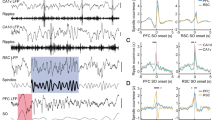 For spindle detection, the signal was band-pass filtered at 12–16 Hz, and the root mean square (RMS) signal was calculated based on a 200-ms window followed by an additional smoothing with the same window length. A spindle event was identified whenever the smoothed RMS signal exceeded a threshold, defined by the mean plus 1 s.d. of the RMS signal across all NREM data points, for at least 0.4 s but not longer than 3 s. Time points exceeding an upper threshold determined by the mean RMS signal plus nine times its s.d. were excluded. Lastly, spindles were required to exhibit a minimum of six cycles in the raw iEEG signal. The onset (start) and offset (end) of spindles were defined as the upward and downward threshold crossings, respectively, of the smoothed RMS signal. Unless otherwise noted, spindle centers were defined as the maximal trough.