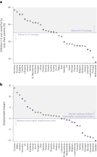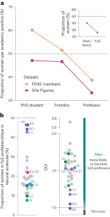 The data in Fig. 1 come from two sources. The GCI information, the percentage of European women per academic position and the percentage of women among grade A (full) professors by country in the natural sciences are taken from the report She Figures 2021 (European Commision, 2021a; source: Women in Science database, DG Research and Innovation – T1_questionnaires). The dataset of FENS members was obtained via personal communication with the FENS Office and represents FENS members as of February 2023. We note that only 3,223 of 20,865 members provided information on their position and gender; these data are used in this plot. The data in Fig. 2 come from two separate publicly available datasets (online data codes: lfst_hheredty, ilc_caparents) from Eurostat, the statistical office of the European Union (https://ec.europa.eu/eurostat). The ‘employment impact’ was calculated by subtracting the employment rates of women with children from the employment rates of women without children.