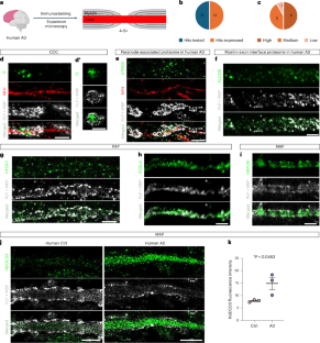 Y.C. and J.G. conceived and designed the study. Y.C. performed proximity labeling proteomics and western blotting and proteomics data analysis. J.K. and T.T.L. performed LC–MS/MS and data analysis. A.C.N. supervised the proteomics experiments and analysis. M.S., Y.C. and J.R. performed the integrative pathway enrichment analysis. I.P.-d.-S., Y.C. and E.P. performed the cell–cell communication analysis. A.H. performed pathological evaluation of human brain specimens and provided the tissues. Y.C., P.T., A.B. and T.H. performed immunofluorescence and confocal imaging. P.T., T.H. and P.Y. performed myelin analysis. F.C., Y.C., T.H. and L.T. performed expansion microscopy and imaging. L.A.F., Y.C. and T.H. performed STED imaging, image analysis and quantification. T.H., P.T., A.B. and R.W. performed quantifications. Y.C. performed electron microscopy sample preparation. Y.C., T.H., P.T., A.B. and R.W. performed statistical analysis. Y.C. and J.G. prepared the manuscript. J.G. supervised the study.