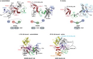 Lechtenberg, B. C. et al. Structure of a HOIP/E2~ubiquitin complex reveals RBR E3 ligase mechanism and regulation. Nature 529, 546–550 (2016). This paper describes the first structure of an RBR module in the active form in complex with an E2~Ub conjugate.