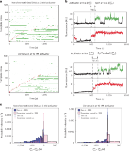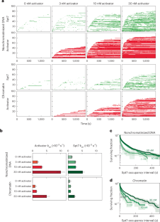 Effects of different activator concentrations on SAGA dynamics. a. Representative time records of Gal4-SNAPDY649-VP16 activator on non-chromatinized and chromatinized templates at 10 nM and 30 nM activator concentrations. Note the intensity jumps indicating that multiple activator molecules can bind simultaneously to the five Gal4 binding site UAS. b. Rastergrams of SAGA (Spt7-SNAPDY549, green) and Activator (Gal4-SNAPDY649-VP16, red) binding to ‘off-target’ areas of the slide where no template DNA is visible. 100 randomly chosen off-target locations show only sparse activator and Spt7 binding events at various activator concentrations (0, 3, 10 and 30 nM). c. Cumulative time-to-initial-binding distributions for Spt7-SNAPDY549 (upper panels) and Gal4-SNAPDY649-VP16 (lower panels) on non-chromatinized (light colors) versus chromatin (dark colors) templates at various activator concentrations (0, 3, and 10 nM). Gray curves show off-target background binding to slide surface, and dashed lines indicate curve fits. The corresponding data for 30 nM activator appears in Fig. 4c. Fit parameters are reported in Supplementary Table 5. d. Template-specific SAGA arrival frequencies (± S.E.) on chromatinized (left panel) and non-chromatinized (right panel) templates when activator is present or absent, calculated as in Fig. 2e. Four different activator concentrations (0, 3, 10 and 30 nM as indicated in key) were tested. Error bars show standard error, and n represents the number of Spt7 arrival events. Note that at 0 nM activator there is no ‘activator presence’, so the total frequency of Spt7 binding is all ‘during activator absence’. e. Cumulative survival plots of the time difference between Gal4-SNAPDY649-VP16 arrival (\({t}_{{Act}}^{{arr}}\)) and the first subsequent Spt7-SNAPDY549 arrival (\({t}_{{Spt}7}^{{arr}}\)) on chromatin (left panel) and non-chromatin DNA (right panel). Three different activator concentrations (3, 10, and 30 nM) were examined. Shaded regions indicate 90% confidence intervals obtained by bootstrapping. n represents the number of time intervals in each condition.