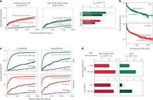 a. Dual color rastergrams of Gal4-SNAPDY649-VP16 and Spt7-SNAPDY549 binding events on template with five Gal4 binding sites. Activator binding records from 100 randomly chosen non-chromatinized (upper panels) and chromatinized (lower panel) template locations were binary-coded (red color indicates colocalization with DNA) and sorted by time to first activator binding, from bottom to top. Next, corresponding binary-coded SAGA binding records (green) from the same template were overlaid. Simultaneous binding of SAGA and activator was colored as blue. Increasing activator concentrations (3, 10, and 30 nM Gal4-SNAPDY649-VP16) are shown from left to right. b. Gal4-SNAPDY649-VP16 (10 nM) binding to non-chromatinized DNA templates containing a single Gal4 binding site (1xG4bs), in the absence of NTPs. Left panel shows cumulative time-to-initial-binding distribution of Gal4-SNAPDY649-VP16 on the template (red) or off-target (gray) locations. Dashed lines are curve fits (parameters in Supplementary Table 5). Right panel displays dual color rastergram of Gal4-SNAPDY649-VP16 activator (red) and Spt7-SNAPDY549 (green) binding records from 100 randomly chosen templates. Intervals when both are bound are colored in blue. c. Long duration activator occupancy can occur on DNA with a single Gal4 binding site. Survival plots of Gal4-SNAPDY649-VP16 occupancy intervals at locations of single Gal4 UAS containing template (red) or at off-target locations (gray). Bi-exponential fit parameters and numbers of events are listed in Supplementary Table 6.