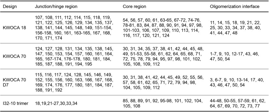 Extended Data Table 1 List of residues comprising the junction/hinge regions of KWOCA 18, KWOCA 70, KWOCA 70 D7, and the I32-10 trimer, as well as the core region used for comparison