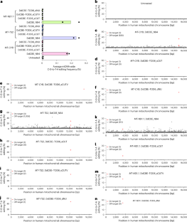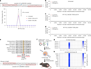 a–f, Average C•G to T•A editing efficiencies at on-target (red dots, designated target site) and off-target (gray dots) sites across mtDNA for MT-CYB-mDdCBE (a), MT-CYB-mDdCBE-TOD6 (b), MT-ND1.1-mDdCBE (c), MT-ND1.1-mDdCBE-TOD6 (d), MT-ND3-mDdCBE (e) and MT-ND3-mDdCBE-TOD6 (f). Sites with average editing frequency greater than 1% are shown. Data are shown as means from n = 2 independent experiments. g, Venn diagram showing the overlap of off-target sites among MT-CYB-mDdCBE, MT-ND1.1-mDdCBE and MT-ND3-mDdCBE. h, Venn diagram showing the overlap of off-target sites among MT-CYB-mDdCBE-TOD6, MT-ND1.1-mDdCBE-TOD6 and MT-ND3-mDdCBE-TOD6. Source data are provided as a Source Data file.