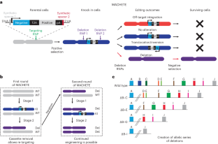 MACHETE is a clustered regularly interspaced short palindromic repeats directed Cas9-based, two-stage system for creating megabase-sized genomic deletions: first, a bicistronic positive/negative selection cassette is inserted into the locus of interest, then single-guide RNAs are added to engineer the intended deletion. Only cells that have lost the locus survive the negative selection, thus greatly enriching for cells with deletions.