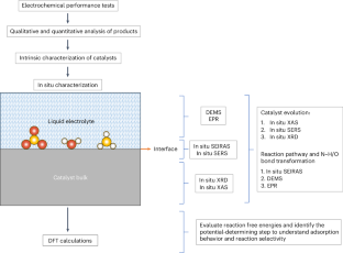 Ex situ characterization of the materials and products of electrochemical reactions provides valuable information but does not track intermediates and their evolution. This Protocol integrates bulk and surface characterization techniques with in situ/operando spectroscopies, electrochemical measurements and density functional theory calculations to better understand the reaction mechanism.