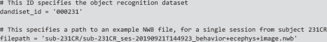 In this section, we provide some example code demonstrating how to load the data. It can be run directly on Dandi Hub without downloading any data. The same code is also available as a JupyterLab notebook at https://github.com/cxrodgers/NwbDandiData2022/blob/main/UsageNotes.ipynb.