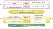 We aggregated the 3-hourly W time series to create NG-IDF curves for selected durations ranging from 24 to 72 hours due to the absence of diurnal variability in the input precipitation data. For each duration, we determined the water year and calendar year annual maximum (AM) W and followed the NOAA Atlas 1419 to fit a generalized extreme value (GEV) distribution to the 1951–2013 AM W datasets based on L-moments statistics47, excluding the first year to avoid initial condition uncertainty. We used the same GEV distribution to compare frequency estimates across durations and locations. We tested the stationarity assumption of the AM W data using the nonparametric Mann-Kendall test48,49 and provided trends for statistically significant cases at the 95% confidence level. For significant trends, we detrended the AM W time series using Sen’s slope50 while maintaining the time series average. In total, we created four NG-IDF curves for each location and LULC, using 1) water year AM W, 2) detrended water year AM W, 3) calendar year AM W, and 4) detrended calendar year AM W for average recurrence interval (ARIs) of 2, 5, 10, 25, 50, 100, and 500 years. A Monte Carlo (MC) simulation method19,47 was used to consider sample data uncertainty in frequency analysis. After estimating the parameters of GEV distribution using the L-moments statistics, a total of 1,000 MC synthetic data sets were generated with the same record length. We then fitted GEV distribution to each MC synthetic data set using the L-moments statistics and estimated the associated values of the selected ARIs. Therefore, a total of 1,000 ensemble members were generated to quantify the uncertainties associated with NG-IDF curves. We provided the 90% confidence intervals using the 5% and 95% quantiles of the ensemble members. To provide a reference for comparison, we utilized the same methodology to create PREC-IDF curves with water year AM P and calendar year AM P. All trend and MC analyses were performed using the “trend”51 and “lmom”52 package in R, an open-source software environment.