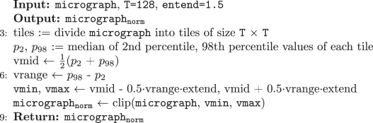 In cryo-EM data processing, the pixel values in raw cryo-EM movies typically represent the number of electrons detected by the beam at a specific time, usually in integer format. After preprocessing steps such as gain correction and motion correction, the resulting micrograph pixel values represent the corrected cumulative electron dose, typically in floating-point format. However, cryo-EM micrographs often exhibit significant noise and low contrast, making it difficult to distinguish protein particles from the background. To improve visualization, we introduced contrast normalization. The core idea is that protein particle pixel values are concentrated in a narrow range, while background regions (e.g., ice and carbon layers) have extreme pixel values. By adjusting the pixel value range to focus on the protein particle region, we enhance the contrast between particles and the background. The implementation details are in Algorithm 1.