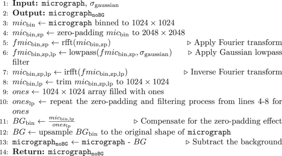In cryo-EM micrographs, uneven ice thickness affects image processing and the quality of the final reconstructed density maps. Specifically, non-uniform ice distribution leads to variations in contrast between particles and the background across different regions of the micrograph, particularly impacting the accuracy of particle picking models. To address this, we used Gaussian blur to estimate the ice background and subtracted it from the original image, achieving uniform contrast. The implementation details can be found in Algorithm 2. Notably, CryoSPARC’s Patch Motion Correction algorithm automatically performs background subtraction, while other motion correction algorithms without this feature require an additional step for background removal.