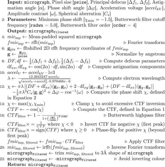To mitigate the impact of low signal-to-noise ratios on model training, we applied band-limiting and CTF filtering to the micrographs. Specifically, we first downsampled the micrographs to a pixel size of about 3 Åto minimize high-frequency noise. Then, using the CTF parameters obtained from CTF estimation, we inverted the CTF before the first peak and applied phase flipping after the first peak. Before the first peak, we multiplied the frequency domain by the reciprocal of the CTF curve; after the first peak, we applied phase flipping by multiplying by the sign of the CTF curve. The implementation details are in Algorithm 3.