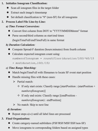 The data preprocessing pipeline’s second stage involves processing the manually annotated text files (named in “YYYYSF” format, which records all spread-F events that occurred in that year, including their time intervals and types) and synchronizing them with the preprocessed ionogram images. This synchronization requires careful temporal alignment between two distinct timestamp formats: the ionograms maintain the original ionosonde output’s “YYYYMMDDhhmmss” naming convention, while the manual annotations utilize the more compact DOY (day-of-year) dating system. This crucial matching process ensures accurate correspondence between each preprocessed ionogram and its expert-annotated Spread-F classification label while preserving the temporal integrity of the entire dataset.