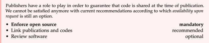 Following the wide adoption of open science practices scientists and publishers, we propose to tackle the reproducibility crisis by enforcing the open-source publication of code alongside papers. Ugly code is always better than no code50. Sharing code has been made extremely easy with Zenodo or Software Heritage, even though it still requires a minimal experience with version control tools. In that context, publishers have a role to play in order to guarantee that code is not only promised, but actually shared at the time of publication. We cannot be satisfied anymore with the current recommendations according to which availability upon request is still an option. Case in point, the Nature journal received severe criticism51 from the machine learning community, following the publication of McKinney et al.52. Haibe-Kains et al.51 explains that the lack of details of the methods and algorithm code undermines its scientific value. This criticism lead to a policy change for the given journal.