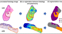 We have recently identified polarized light imaging (polarimetry) as a suitable targeting technology for MS, potentially capable of a significant time reduction for MS imaging and analysis of biological tissues18. For efficient guidance of DESI-MS imaging using thin tissue slices, it is desirable to use the same slice for polarimetry guidance, MS analysis and subsequent histopathology staining; the last step is necessary for ground-truth confirmatory imaging3, 5, 6, 19,20,21,22. Our initial research on polarimetry-guided MS made use of multiple tissue sections18, adding complexity to the workflow, wasting tissue, and contributing to potential validation inaccuracies due to both tissue heterogeneity along the sectioning axis7 and sample preparation artifacts. Further, the proof-of-principle study18 did not explore the in situ thick tissue scenario. It is important to note that other wide-field imaging techniques such as Raman spectroscopy23, fluorescence imaging and optical coherence tomography (OCT) can also be used as the survey imaging modality to guide the acquisition of targeted MS images.