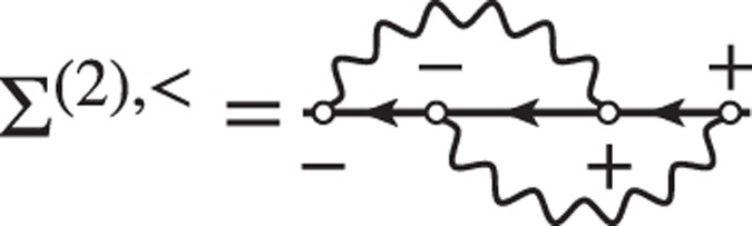 Equation (5) serves as the starting point for numerics; complexity goes into the generation of Feynman diagrams and the determination of the coefficients \({k}_{i}^{(n,\nu )}\). Together with the Padé approximation this is the second important ingredient of our approach. The coefficients are computed purely algebraically by introducing an external time-dependent potential ϕ(1) (for brevity time variables are denoted as \({t}_{i}\equiv i\)) and using the variational derivative technique27 as in the derivation of Hedin’s equations28. As was shown above the bosonic propagator in the present model does not renormalize (loops give zero contribution), i. e., \(\frac{\delta W(12)}{\delta \varphi \mathrm{(3)}}=0\), leading to a simpler set of equations: