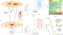 We now move to a more generic case where the spins are randomly distributed over the x − y plane as shown in Fig. 2a. For complete random positioning of the nuclear spins there is still high probability to observe pairing of spins into entangled states. But now the entangled pair state is not only restricted to the singlet sector as it is the case for the 1D chain, but rather into the entangled state \(|{\tilde{S}}_{i,j}\rangle =\frac{1}{\sqrt{2}}[|1,-1\rangle -{{\rm{e}}}^{i\phi }|-1,1\rangle ]\). The additional phase ϕ arises when the difference in the x and y couplings of the pairing spins to the central spin S has a large variation. But we show the pairing in the real space and in the coupling space of a spin ensemble comprised of 8 spins. The choice of pairing is purely determined by the minimal inhomogeneity of the partners in their coupling to the central spin. For example in the 1D-case (see Fig. 1b), the inhomogeneity decreases for farther away spins from the central spin. Hence pairing starts from the end of the chain farther away from the central spin and defines the pairing pattern in the chain. In the 2D-case the situation is more complex as the inhomogeneity both in the x and y direction together determine the pairing partners. Additionally, we see that singlets are not the only choice and there are four different relative phases \(\phi =\{0,\frac{\pi }{2},\pi ,\frac{3\pi }{2}\}\) dependent on the x − y position of the spins. For example in Fig. 2a, where spin 5 could only pair with its farthest partner 6, as all other spins have paired up. Remarkably, even though these spins are (effectively) weakly interacting, they still tend to polarize into entangled pairs rather than polarizing into some unentangled pure states.