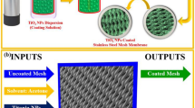 Surface morphology of the coated stainless steel meshes was studied from the SEM images recorded on a TESCAN FERA3 field emission scanning electron microscope (FE-SEM). Contact angle were measured by a KRUSS (DSA20X, GmbH Germany) standard drop shape analysis system using 6 ± 1 µL water/oil droplet at room temperature. For a more accurate contact angle measurement the average value of measurements were taken. The set up for oil water separation is basically two Pyrex glass tubes with 15 cm length and 1.7 cm diameter having flanged edges to rigidly hold the coated meshes with proper O–ring. The oils used for testing were octane (Sigma Aldrich), hexadecane (Sigma Aldrich) and olive oil (local market) and in order to distinguish water and oil, the oil was colored with red dye and the water was colored with the methylene blue dye. Another purpose of using methylene blue is to demonstrate the capability of our coated surfaces in the photocatalytic degradation of organic dyes present in the water permeated from the oil water separation system.