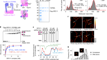 The biochemical characterization of SPO-11 has been hampered by the difficulty in obtaining soluble, monodispersed preparations of the protein. To help overcome this hurdle, we introduced N-terminal six histidine (His)6 and SUMO tags into C. elegans SPO-11 cDNA and expressed the recombinant protein in E. coli (Fig. 1a). The SUMO tag enhances protein solubility but can be easily removed with the (His)6 tag by treatment with the SUMO protease Ulp1. The T7 promoter that is inducible by isopropyl β-D-1-thiogalactopyranoside (IPTG) drives the robust expression of the tagged SPO-11 protein (Fig. 1b). The IPTG-inducible expression of the tagged protein was verified by Western blot analysis using anti-His antibody (Fig. 1b). We devised a purification scheme that entails affinity, ion-exchange, and gel filtration chromatographic steps to purify SPO-11 to near homogeneity (Fig. 1c and d); note that the (His)6 and SUMO tags are removed through Ulp1 protease treatment during purification. The purified, untagged SPO-11 protein (calculated molecular mass of 49,169 Da) migrates in SDS-PAGE analysis as a ~55 kDa species (Fig. 1d), and its identity was established by liquid chromatography-tandem mass spectrometry (LC-MS/MS) (Fig. 1e). Several independent preparations of SPO-11 gave the same results in all the biochemical and biophysical experiments described below.