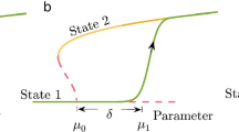 The parameters used in numerical experiments are as follows: j = (1, …, N), N = 10, x f = 0.25, γ = 1.4, M = 0.01, ω j = jπ, τ = 0.2, \({\zeta }_{j}=\frac{1}{2\pi }[{c}_{1}\frac{{\omega }_{j}}{{\omega }_{1}}+{c}_{2}\sqrt{\frac{{\omega }_{1}}{{\omega }_{j}}}]\), where c 1 = 0.1 and c 2 = 0.06 are constant coefficients, dt (step size for computation) = 0.01. For demonstrating preconditioned rate induced tipping (Fig. 3d), the initial conditions chosen are η 1(0) = 0.42, \({\dot{\eta }}_{1}(0)=0.55\), η j,j ≠ 1(0) = 0 and \({\dot{\eta }}_{j,j\ne 1}(0)=0\). The presence of time delay in the model demands additional initial values for η j and \({\dot{\eta }}_{j}\) during the time interval t ∈ [−τ, 0). We set η j = 0 and \({\dot{\eta }}_{j}=0\) in the range t ∈ [−τ, 0) for j = 1, …, N.