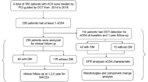 Categorical variables are presented as counts and percentage and compared using a chi-square or Fisherâs exact test. Continuous measurements are expressed as meanâ±âSD for normally distributed variables or median and interquartile range (25th percentile, 75th percentile) for nonparametric data. The Shapiro-Wilk test was used to assess the normality of continuous data. The significance of continuous variables at follow-up compared to baseline measurements was assessed using the Wilcoxon signed-rank test. The Student t-test or Mann-Whitney U test was used for between-group comparisons of biochemical parameters and plaque characteristics. The biochemical parameters and CEC after therapy were calculated by subtracting the baseline values from those at follow up. In addition, we performed multivariate linear regression analysis to examine whether DM has an independent effect on the changes in CEC and plaque morphology after statin treatment. DM status represented the exposure of interest in each statistical model, while dependent outcomes included different measures of changes in plaque severity assessed by OCT (fibrous cap thickness, lipid arc and length, lipid volume index, macrophage arc and length), IVUS (plaque burden, percent atheroma volume and total atheroma volume), and NIRS (maxLCBI4mm). Variables demonstrating significant differences between patients with and without DM were included as additional covariates of DM in each model in addition to known risk factors (smoking, hypertension, BMI). Results were reported as beta coefficients with 95% confidence intervals (CIs) and p values. All reported P values are two-tailed, with a P valueâ<â0.05 indicating statistical significance. All analyses were performed with the use of SAS software, version 9.4.