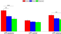 Finally, a significant interaction effect of State × Distractor was found in parietal LPP (Fig. 3) [F(4,116) = 4.6, GG corrected p < 0.01, η 2 p = 0.136]. Specifically, when the participants’ state was negative, amplitudes in response to positive distractors were greater than to neutral ones, as shown by Bonferroni corrected post-hoc comparisons [p < 0.005]; when the state was neutral, negative distractors elicited greater amplitudes than neutral ones [p < 0.05]; and when experiencing a positive state, both negative and positive distractors elicited higher amplitudes than neutral ones [p < 0.001 and p < 0.005, respectively]. Comparing the effect of distractors on LPP between affective states, the interaction effect was confirmed: the difference of negative versus neutral distractors varied significantly from the negative to the positive mood [F(1,29) = 8.0, p < 0.01, η 2 p = 0.216], while the difference between positive and neutral stimuli did not vary [p > 0.05]; further, the difference between negative and positive compared to neutral distractors also varied significantly from the positive to the neutral state, being significant when distractors were positive (compared to neutral) [F(1,29) = 4.3, p < 0.05, η 2 p = 0.129], and non-significant when they were negative (compared to neutral) [p > 0.05].