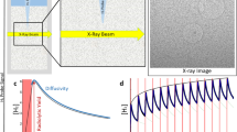 In situ ion irradiation was performed using the Microscopes and Ion Accelerators for Materials Investigations (MIAMI-1) facility45. This consists of a JEOL JEM-2000FX TEM operating at 200 kV coupled to an ion accelerator operating at energies of up to 100 keV. The ion beam is oriented at 30° to the electron beam. In these irradiations the specimens were oriented normal to the electron beam and were heated using a Gatan 652 double-tilt heating holder. Post-irradiation examination was also performed with a JEOL JEM-3010 TEM operated at 300 kV. Helium bubbles were imaged using Fresnel contrast where small cavities appear light in underfocus and dark in overfocus. The cavities are assumed to be bubbles and not voids due to the high concentrations of implanted helium in these experiments. MoO3 crystals were used to calibrate the image rotation between the diffraction patterns and micrographs. A clockwise rotation of the diffraction pattern with respect to the image was found with angles between 4° and 6° when using magnifications of 20k and 40k, respectively, for a camera length of 20 cm.