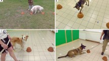 Eleven dogs completed pre-training (see supplementary information for individual dog details). They were then assigned to the experimental (n = 6) or control group (n = 5) on the basis of pre-training performance. This was to ensure that there was no significant difference between experimental and control groups in speed of learning in the final phase of pre-training (trials to criterion: experimental group (n = 6) 223 ± 135.75; control group (n = 5) 196 ± 96.59; t(9) = 0.376, p = 0.715.