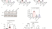 We next sought to functionally validate results from our transcriptome analysis. The enzyme nitric oxide synthase (NOS) was of interest because of its key role in mediating neuroinflammation32, 33. To determine if immunoproteasome inhibition could decrease microglia-mediated inflammation we examined Nos2 (iNOS) gene expression and nitric oxide (NO) levels 24 h following IFNγ treatment. Consistent with our transcriptome data we found iNos is up-regulated in microglia exposed to IFNγ (Fig. 6a). Treatment of BV-2 cells with immunoproteasome inhibitor ONX-0914 resulted in significantly reduced iNos gene expression (Fig. 6a). Further, since CP-690550 reduced immunoproteasome levels, we measured iNos gene expression in BV-2 cells in the absence and presence of the JAK inhibitor and found that iNOS and NO levels were reduced compared to IFNγ alone (Fig. 6b and Supplemental Fig. S4). Elevated production of the iNos gene product NO can result in cell toxicity and has been implicated in neurodegenerative conditions, emphasizing the importance of decreasing NO production in treating brain injury34. We found that ONX-0914 significantly reduced IFNγ-dependent NO production in both BV-2 cells and primary microglia (Fig. 6c and d, respectively). To ensure that the effect of ONX-0914 on NO production were not due to off-target effects, we created a Psmb8 (β5i) Crispr/Cas9n knock-out BV−2 cell line (BV-2 β5i KO). These cells lack the catalytic β5i proteasome subunit (Supplemental Fig. S5), the pharmacological target of ONX-0914. We found that BV-2 β5i KO cells produced lower levels of NO in response to IFNγ (Supplemental Fig. S5b). To rule out the possibility that the β5i BV2 KO cell line lost the ability to respond to IFNγ we next examined CD40, a co-stimulatory protein whose primary activation signal is IFNγ. Flow cytometry analysis revealed that both normal BV-2 and β5i BV-2 KO cells displayed similar increased mean fluorescence intensity (MFI) following IFNγ treatment compared to untreated cells (Supplemental Fig. S5). These data are consistent with our transcriptome analysis showing IFNγ−dependent CD40 gene induction is unaffected by ONX-0914. Immunoproteasome inhibition has been shown to reduce inflammation in rodent models of rheumatoid arthritis, muscular dystrophy, multiple sclerosis and stroke14, 35,36,37. We show here that blocking immunoproteasome assembly or inhibiting its activity reduces IFNγ-dependent NO release, highlighting one potential inflammatory mechanism.